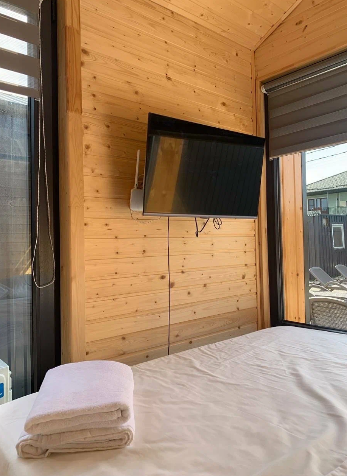 - Оборудование: кондиционер, микроволновая печь, набор посуды, плита электрическая, сплит-система, телевизор, холодильник, электрочайник